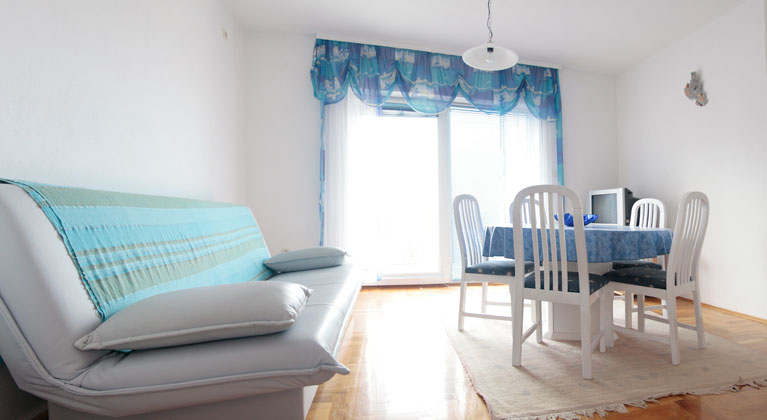 OPIS APARTMANA: Prostrani apartman od **70m2 na prvom katu je klimatiziran** i idealan za obitelji. Sastoji se od dvije dvokrevetne sobe s laminatnim podovima, kupaonice s tušem te velikog dnevnog boravka i kuhinje. Ključna prednost: **izlaz na balkon iz dvije prostorije**! Na raspolaganju su Vam TV, sva posteljina i ručnici.