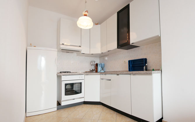 OPREMA U KUHINJI: Potpuno opremljena kuhinja uključuje štednjak na struju i plin, pećnicu, hladnjak s ledenicom, aparat za filter kavu te sav potreban pribor za jelo i kuhanje. **NAPOMENA: Cijeli apartman je klimatiziran.**
